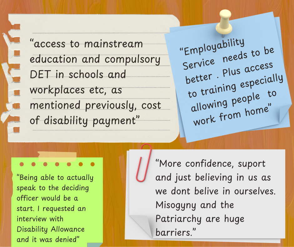“Removing partners income in means testing for social welfare payments would help massively because this disproportionately affects women, especially unmarried women. Have better services for finding jobs that have very specific accommodations, since EmployAbility cannot find jobs that can meet my accommodations either, due to a shortage of them. Create more part-time professional jobs, so that disabled professionals are able to join the workforce again”