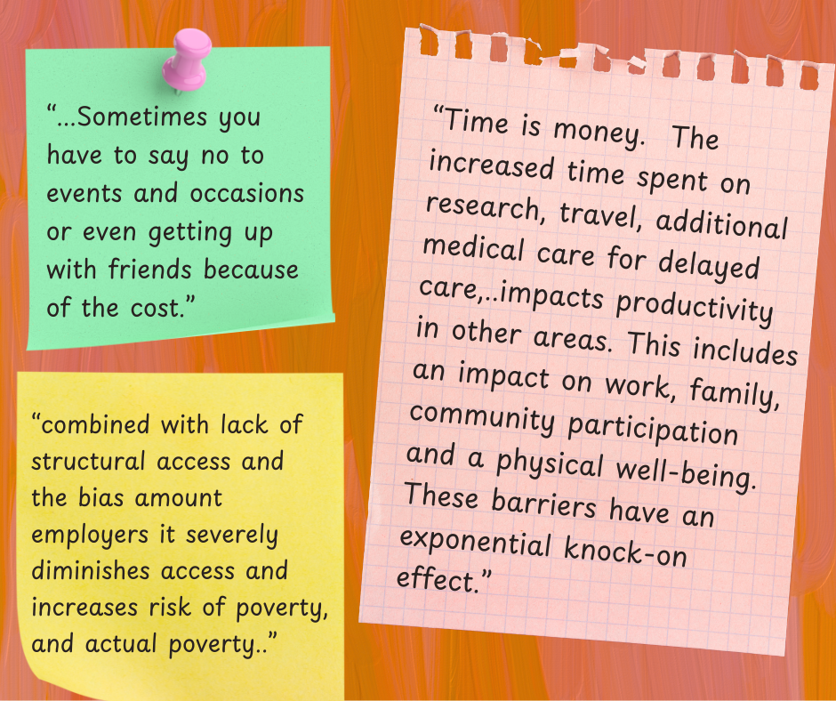 A graphic with an orange and pink background with a brush stroke effect. Three colourful notes display participant feedback. A mint green note with a pink pin reads: “...Sometimes you have to say no to events and occasions or even getting up with friends because of the cost.” A yellow note reads: “Combined with lack of structural access and the bias among employers it severely diminishes access and increases risk of poverty, and actual poverty.” A pink notepad-style sheet reads: “Time is money. The increased time spent on research, travel, additional medical care for delayed care, impacts productivity in other areas. This includes an impact on work, family, community participation and physical well-being. These barriers have an exponential knock-on effect.