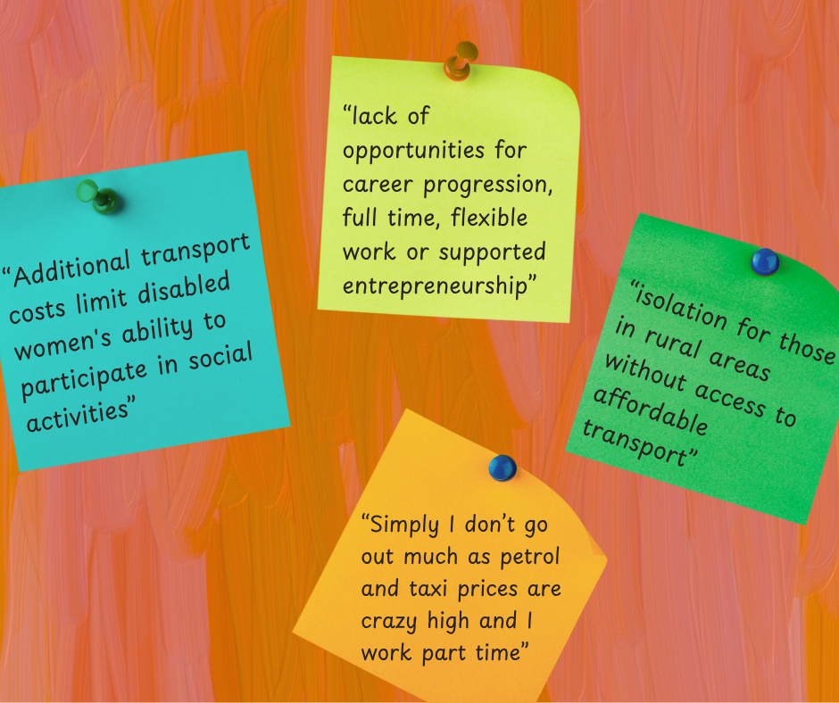 A graphic with an orange and pink background with a brush stroke effect. Four colourful sticky notes contain participant quotes. A blue note reads: “Additional transport costs limit disabled women’s ability to participate in social activities.” A lime green note reads: “Lack of opportunities for career progression, full time, flexible work or supported entrepreneurship.” A dark green note reads: “Isolation for those in rural areas without access to affordable transport.” An orange note reads: “Simply I don’t go out much as petrol and taxi prices are crazy high and I work part time.”