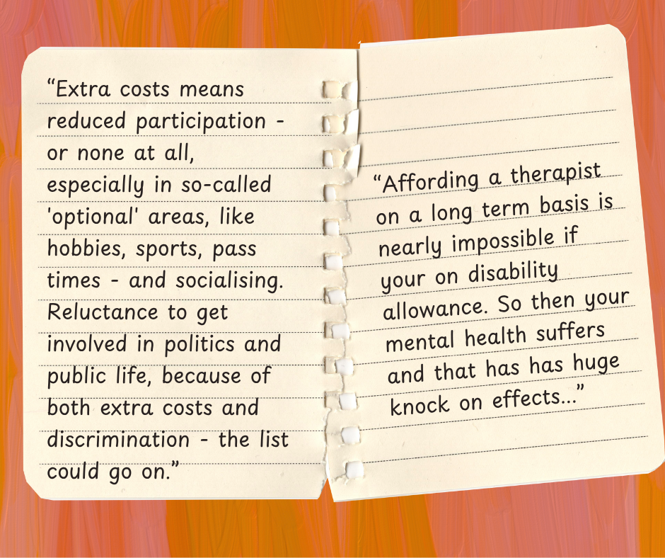 A graphic with an orange and pink background with a brush stroke effect. The image shows an open notebook with two pages of participant quotes. The left page reads: “Extra costs means reduced participation – or none at all, especially in so-called ‘optional’ areas, like hobbies, sports, pass times – and socialising. Reluctance to get involved in politics and public life, because of both extra costs and discrimination – the list could go on.” The right page reads: “Affording a therapist on a long term basis is nearly impossible if you’re on disability allowance. So then your mental health suffers and that has huge knock-on effects…”