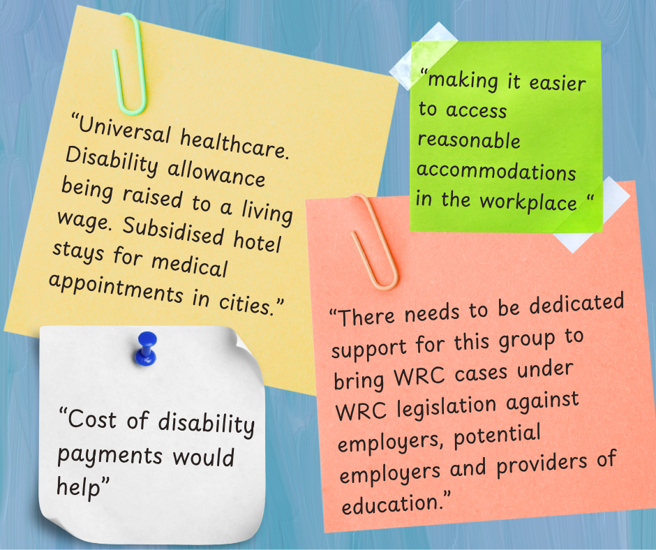 A graphic with a light blue background featuring a brush stroke effect. Four colourful paper notes display participant feedback. A large yellow note with a green paperclip reads: “Universal healthcare. Disability allowance being raised to a living wage. Subsidised hotel stays for medical appointments in cities.” A green note reads: “Making it easier to access reasonable accommodations in the workplace.” A red-orange note reads: “There needs to be dedicated support for this group to bring WRC cases under WRC legislation against employers, potential employers and providers of education.” A white pinned note reads: “Cost of disability payments would help.”
